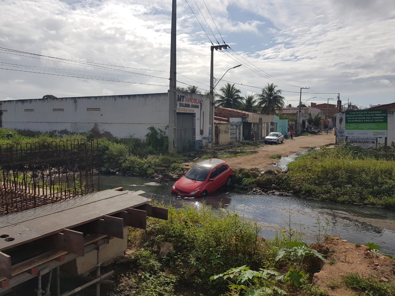 Na madrugada de ontem (28), um veículo caiu em uma das pontes inacabadas, prometidas pela prefeitura. Um homem perdeu o controle do veículo, avançou e caiu no riacho onde deveria haver a ponte, na rua Rui Barbosa. No local já placas de sinalização instaladas pela construtora responsável.